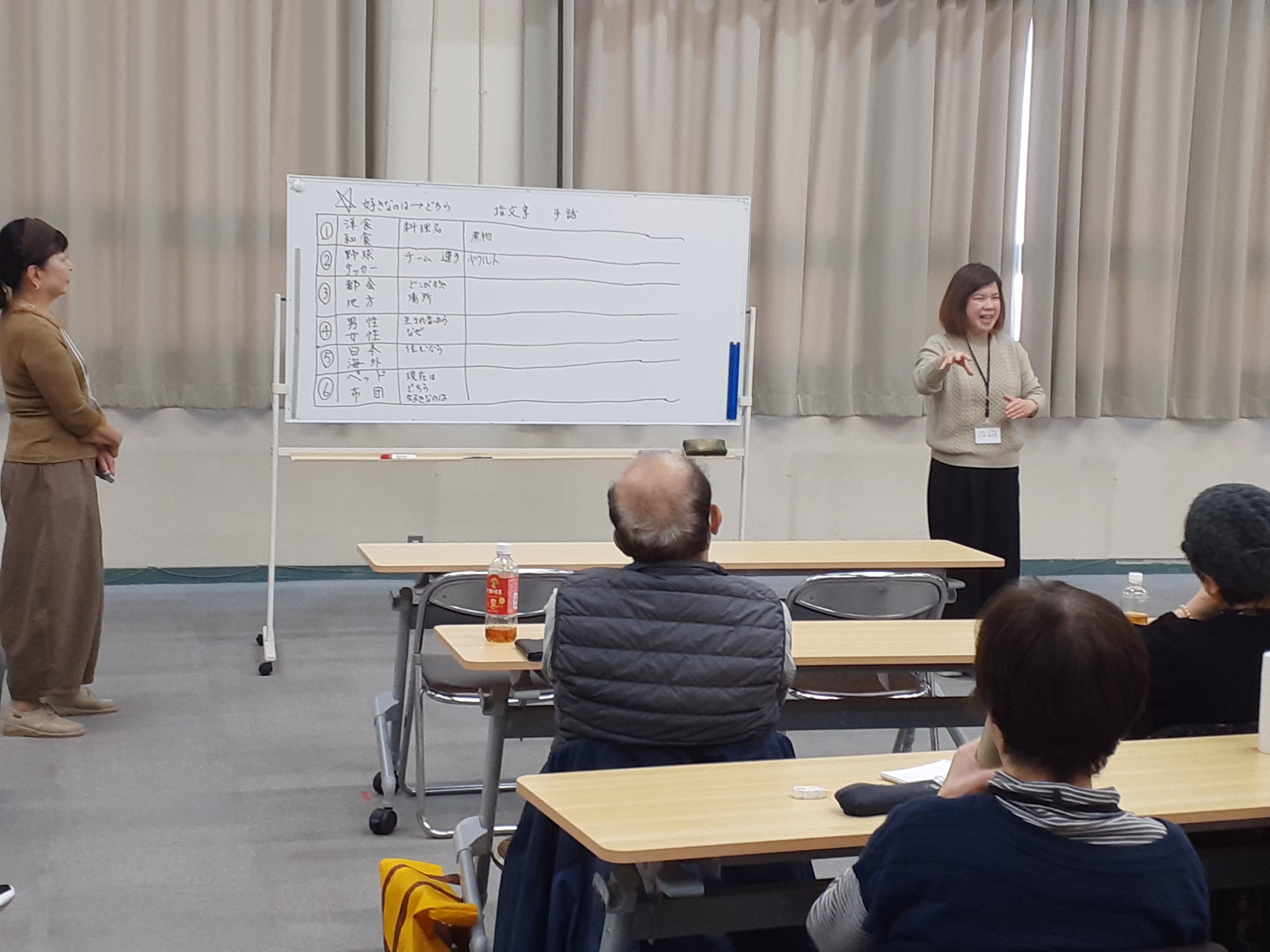 12月8日☆『12月といえば』指文字→手話「クリスマス」「餅つき」「NHK紅白歌合戦」などなど、エピソードを交えながら発表が続きました。☆『好きなのはどちら?』 「洋食・和食」「野球・サッカー」「都会・地方」「日本・海外」「ベッド・布団」 皆さんの意見は様々、「都会・地方」では皆さん三島が一番で意見がまとまりました。