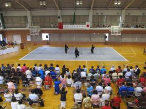 三島市の友好都市の中国浙江省麗水市から、麗水市体育サービスセンターの徐晨虹さんを団長とする武術太極拳交流団12人が来島し、10月19日に、市立北小学校の体育館において、交流会が開催されました。昨年、三島市武術交流訪問団が麗水市を訪れ交流したことがきっかけとなり、今回の交流会の三島市開催が実現しました。豊岡武士三島市長と徐団長の挨拶のあと、スポーツ・武術及び文化交流に関する協定書に、麗水市体育サービスセンター、麗水市武術協会、静岡県中国武術協会、三島市国際交流協会の4団体が調印、交流の促進を確認しました。