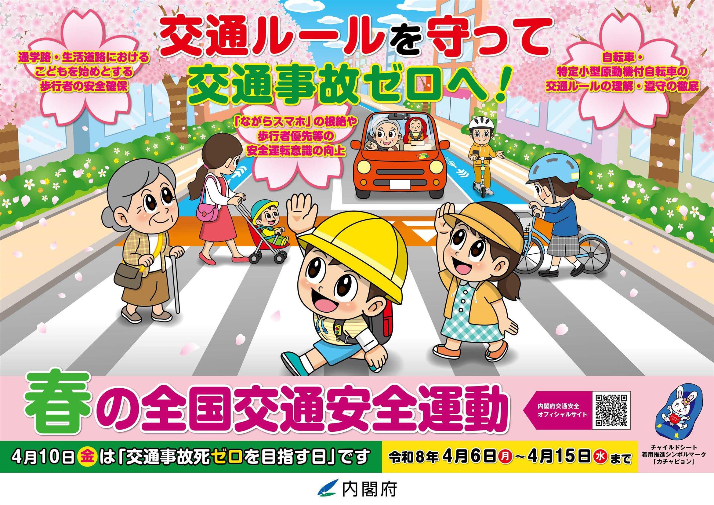 今年も安全活動の意識強化をお願いいたします!期間:令和8年4月6日(月)〜4月15日(水)交通事故死ゼロを目指す日:4月10日(金)新入生を含めた皆さん! ご安全に。