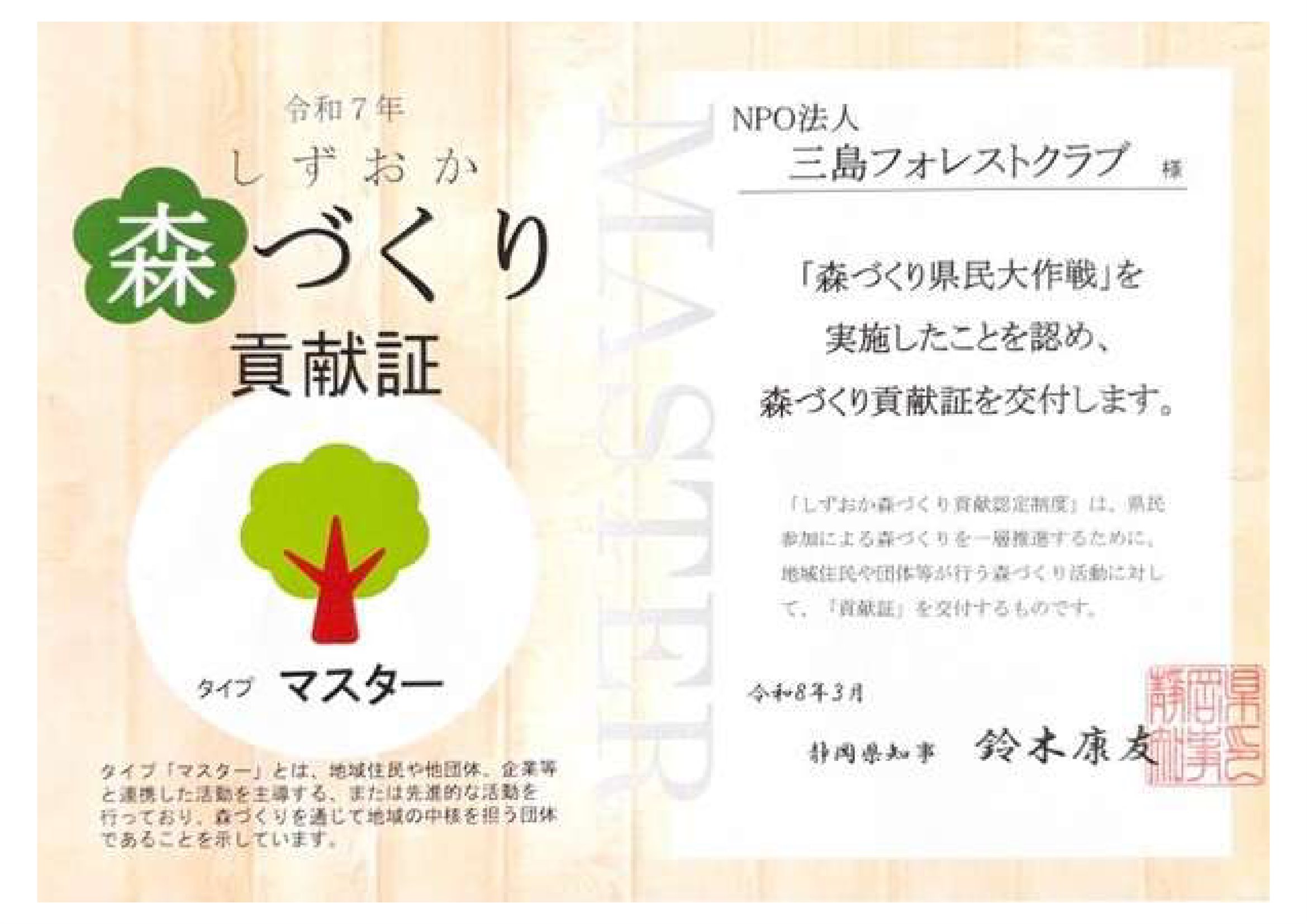 「2025年 しずおか 森づくり貢献証 タイプ マスター」を静岡県から頂きました。2018年から8年連続の受賞になります!