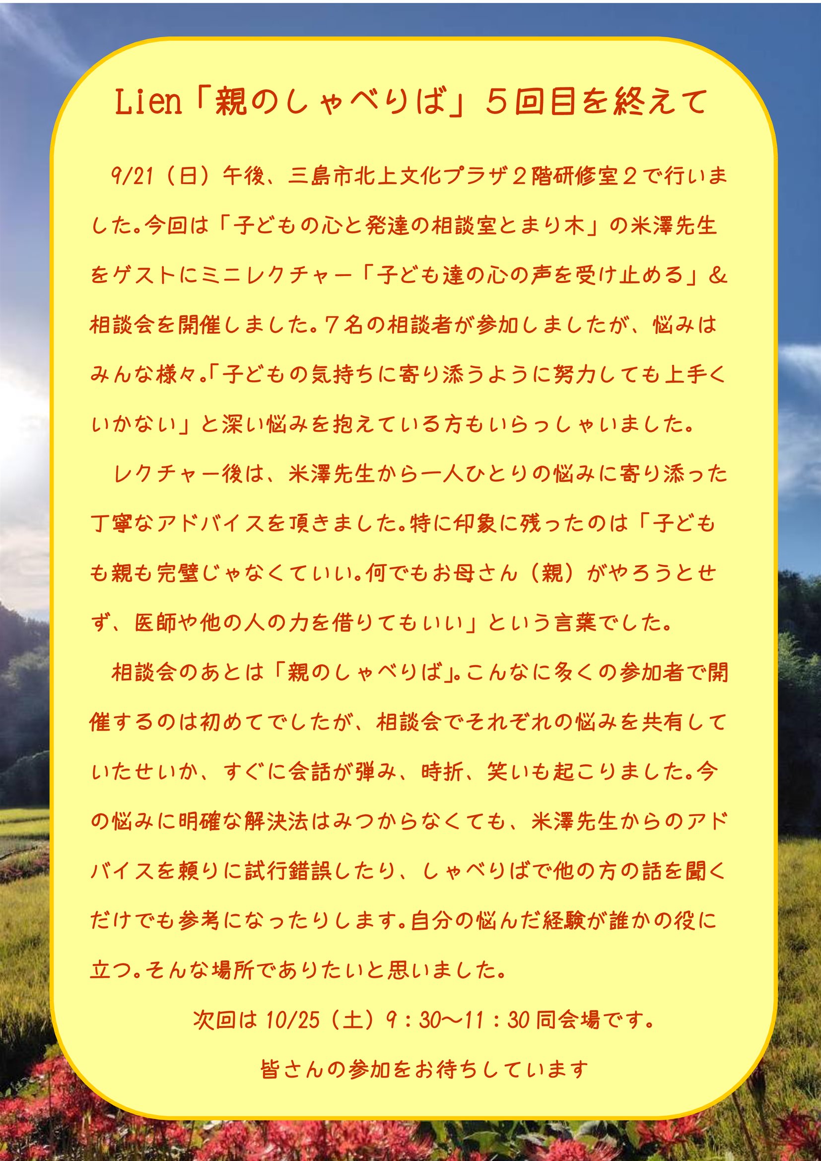 9/21(日)午後、三島市北上文化プラザ2階研修室2で行いました。今回は「子どもの心と発達の相談室とまり木」の米澤先生をゲストにミニレクチャー「子ども達の心の声を受け止める」&相談会を開催しました。7名の相談者が参加しましたが、悩みはみんな様々。「子どもの気持ちに寄り添うように努力しても上手くいかない」と深い悩みを抱えている方もいらっしゃいました。