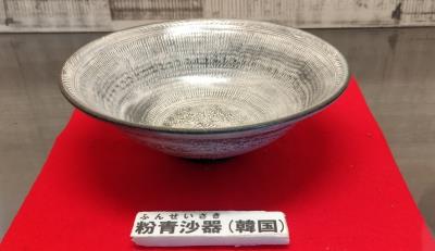 室町時代末期(1550年頃)に朝鮮半島から紛青紗器(ふんせいさき)とよばれる茶碗が日本に入ってきました。この茶碗は薄ねずみ色の粘土にヘラやスタンプで文様を描いて白土で化粧をし、透明釉(とうめいゆう)をかけて焼いたものです。こうして作られた茶碗の文様が三嶋暦の文様によく似ていたため、当時の茶道をたしなむ人たちから「三島手(みしまで)」、「暦手(こよみで)」と名づけられ愛用されていました。現在でも日本各地で三島茶碗は作られており窯元や陶器店で手に入れることができます。