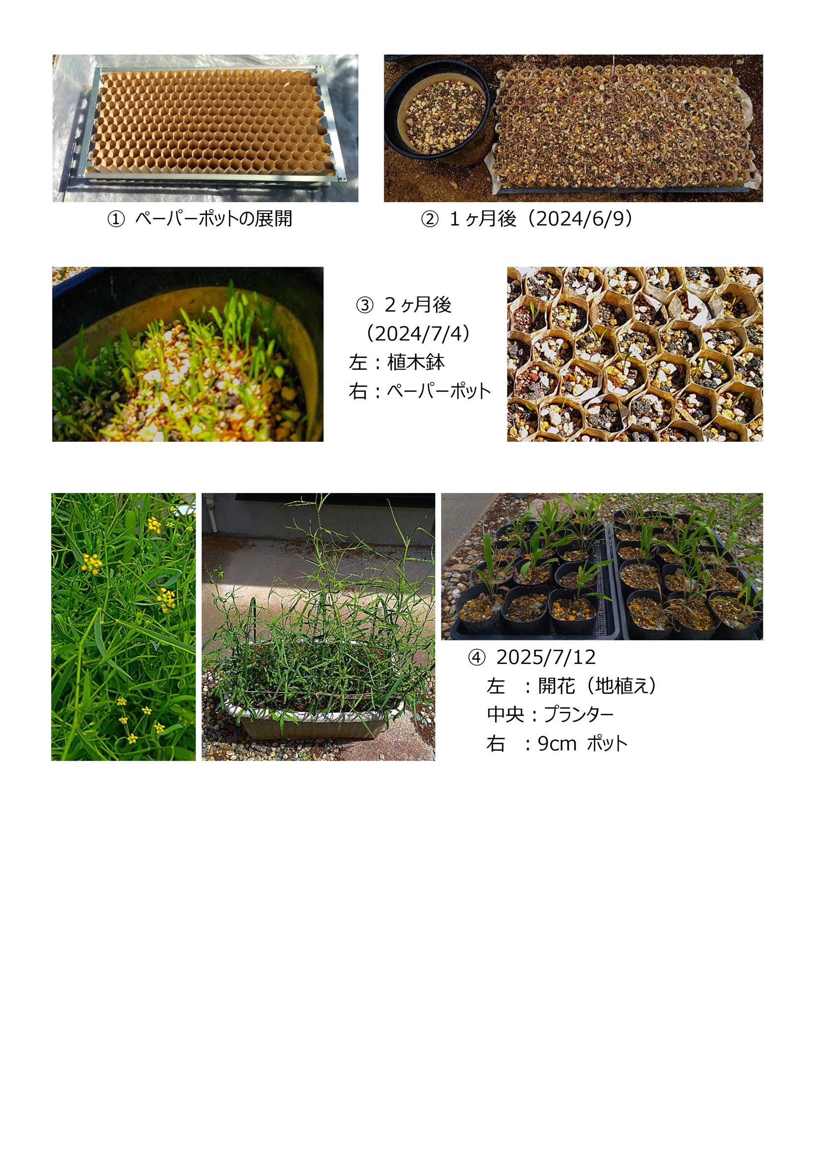 次に2024/5/12に植木鉢にたっぷりのタネを播種したものと並べ、再度、ペーパーポットに播種しました。1ヶ月後、植木鉢では発芽が見られましたが、ペーパーポットでの発芽は見られませんでした(写真 A)。更に1ヶ月経過した7月初旬まで待つことにより、ペーパーポットにおいても発芽が観察されました(写真 B)。